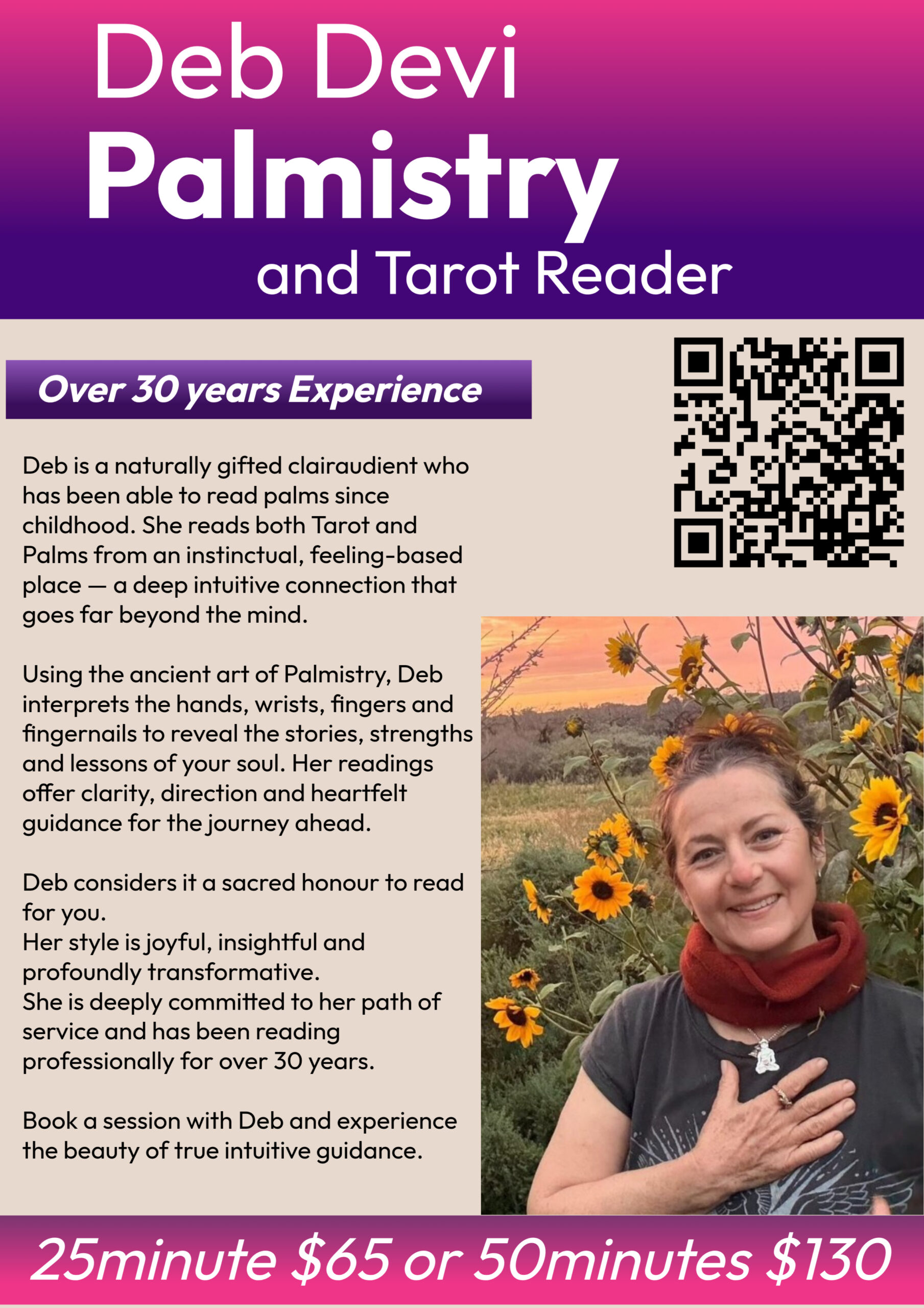 Deb is a naturally gifted clairaudient who has been able to read palms since childhood. She reads both Tarot and Palms from an instinctual, feeling-based place — a deep intuitive connection that goes far beyond the mind.
