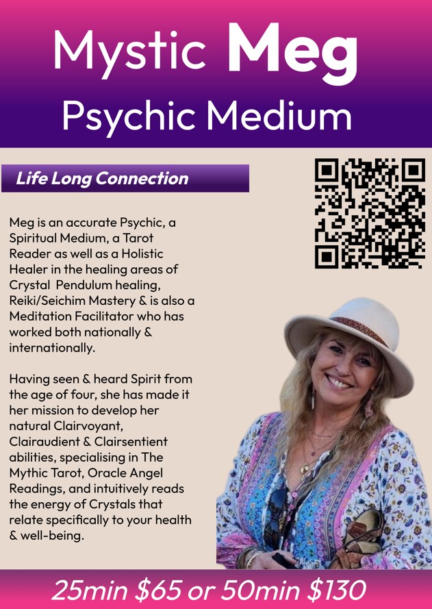 Meg is an accurate Psychic, a Spiritual Medium, a Tarot Reader as well as a Holistic Healer in the healing areas of Crystal Pendulum healing, Reiki/Seichim Mastery & is also a Meditation Facilitator who has worked both nationally & internationally.