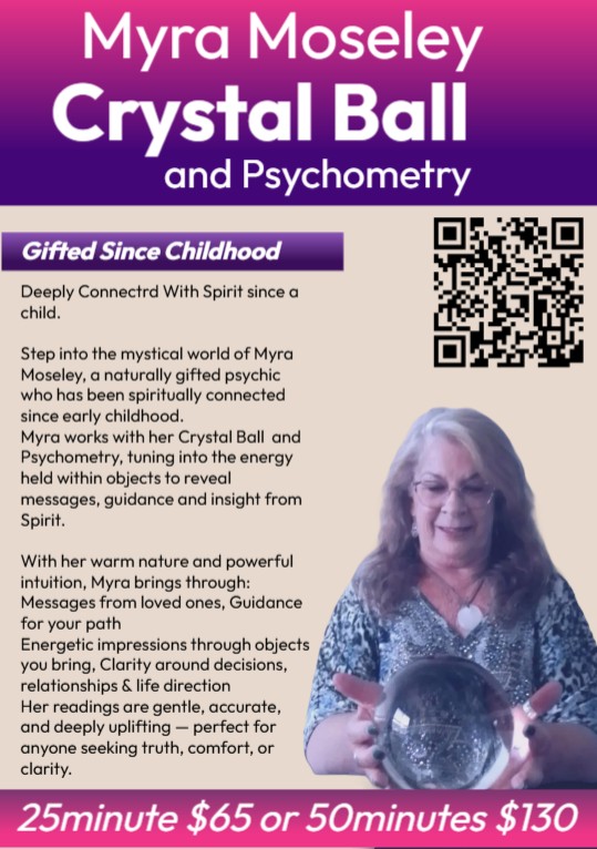Myra works with her Crystal Ball and Psychometry, tuning into the energy held within objects to reveal messages, guidance and insight from Spirit. With her warm nature and powerful intuition, Myra brings through messages from loved ones, guidance for your path, energetic impressions through objects you bring, and clarity around decisions, relationships & life direction.