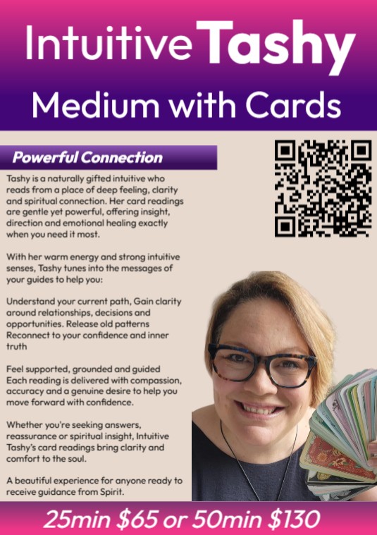 Whether you’re seeking answers, reassurance or spiritual insight, Intuitive Tashy’s card readings bring clarity and comfort to the soul, a beautiful experience for anyone ready to receive guidance from Spirit.