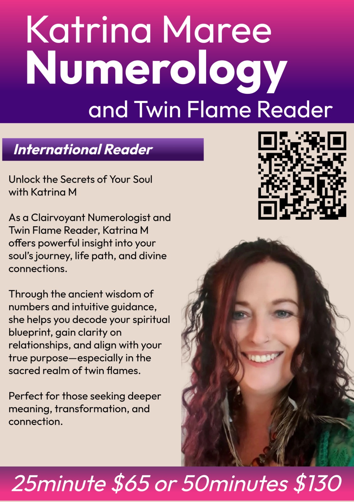 Unlock the Secrets of Your Soul with Katrina M. As a Clairvoyant Numerologist and Twin Flame Reader, Katrina M offers powerful insight into your soul’s journey, life path, and divine connections.