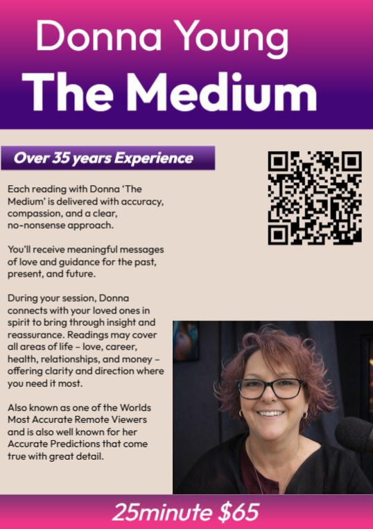 Donna is appearing exclusively at the Majik Gift Country Music Readers Expo, from 17–25 January 2026 in the Attunga Room at Ibis Styles Tamworth, NSW. Readings are available daily from 11:00am to 5:00pm in a peaceful setting designed for clarity and comfort.